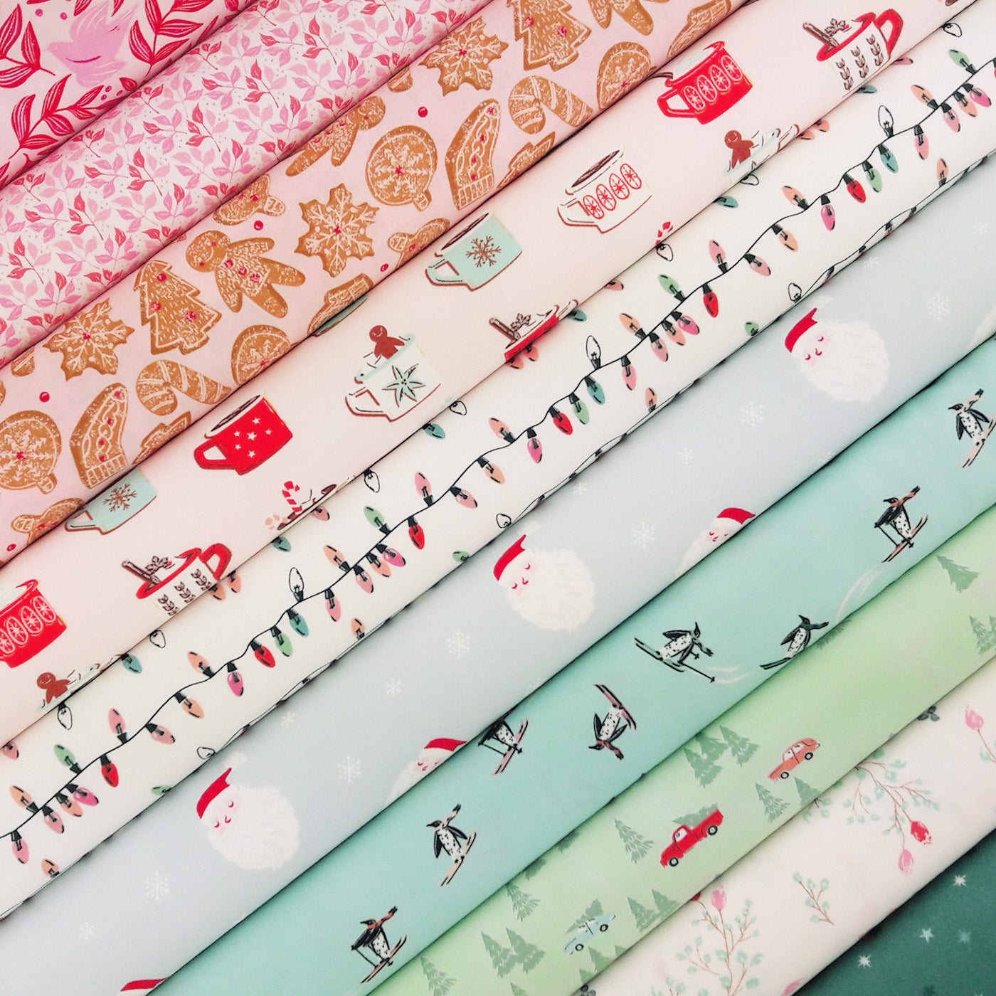 Fabric designs; Wisp Bliss, Starry Sky, Ginger Bliss, Festive Twinkle Light, Cut and Carry Trees, Wisp Crisp, Twinkle Skies Pine and Tiny Buck Forest Mint.