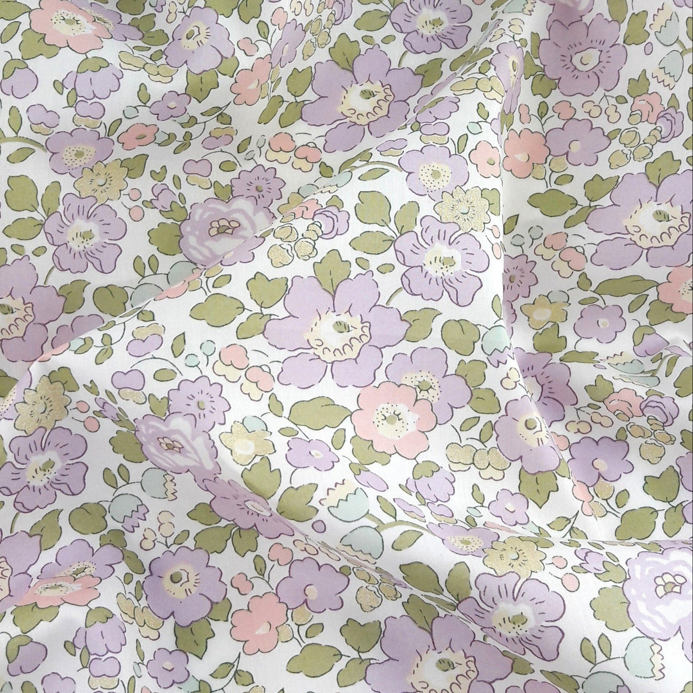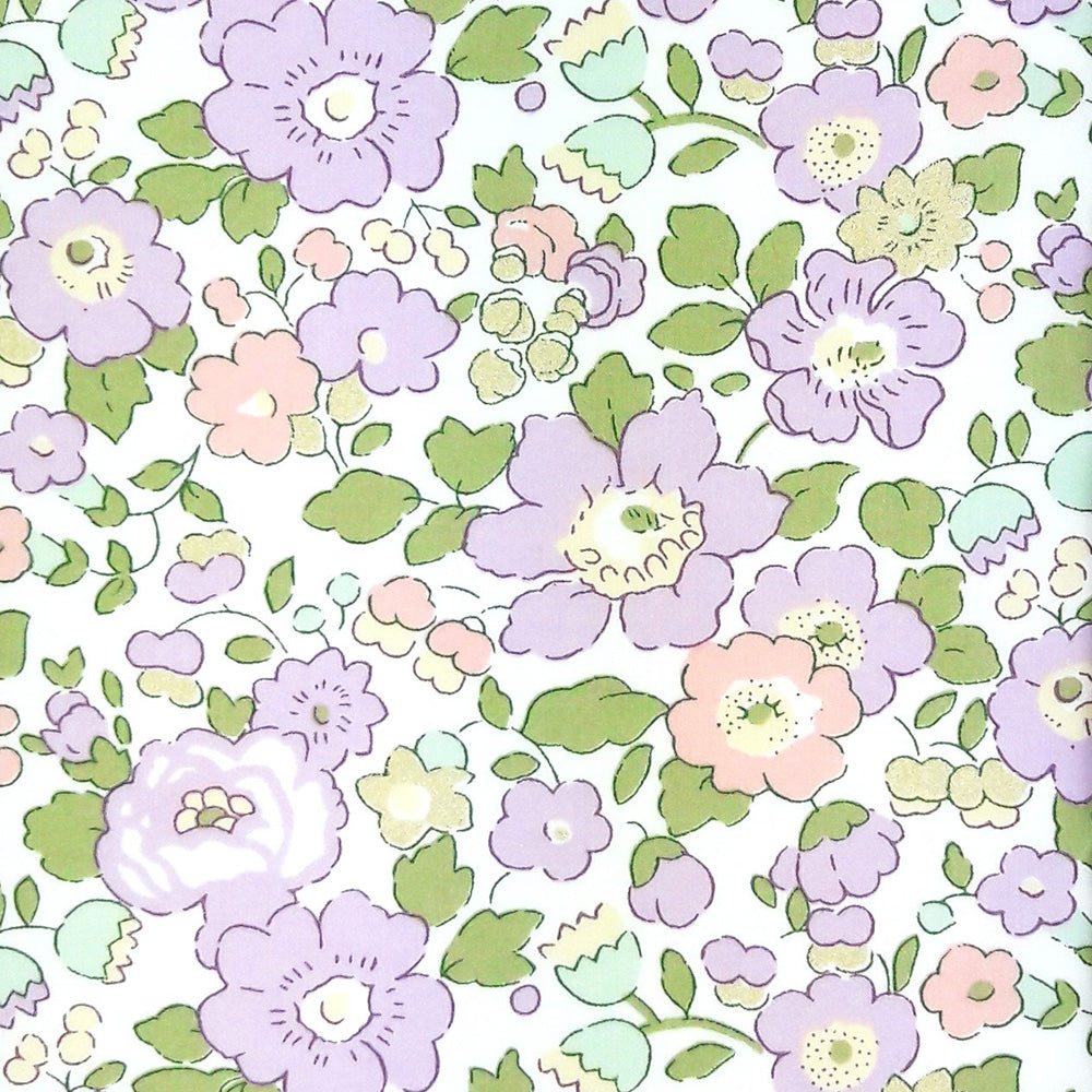 Betsy in pale purple with pale gold highlights, part of the 2025 Classic Metallic collection from Liberty Fabrics. This stylised small floral design was designed for Liberty in 1933 and reflects the bold, relaxed style of the era.