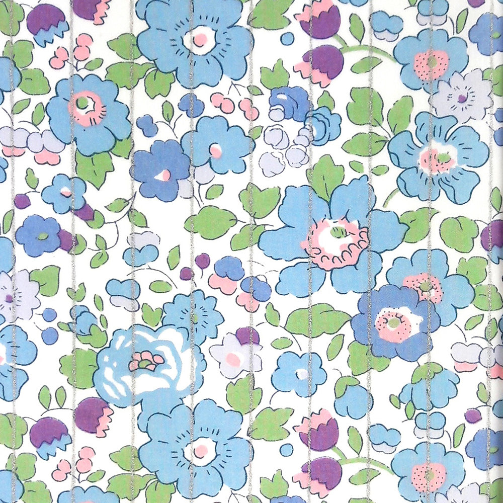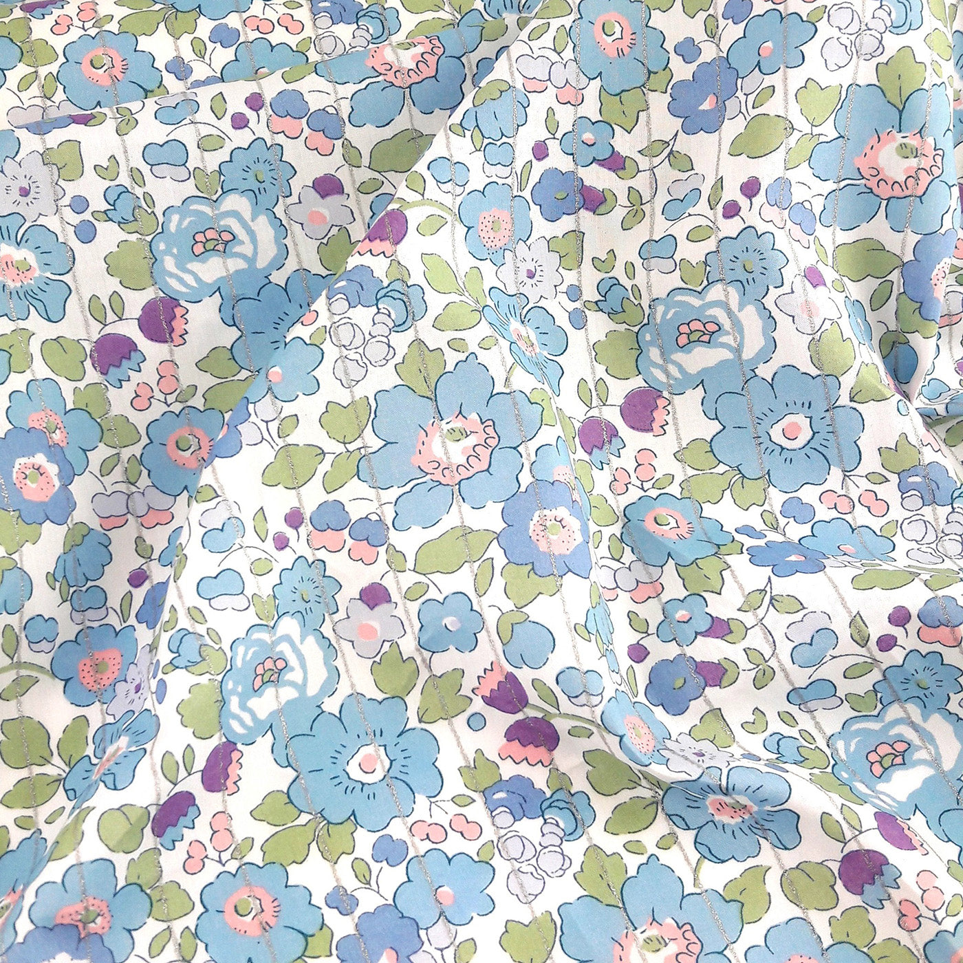 Betsy Stripe in Teal Blue with fine, metallic silver stripes part of the 2025 Classic Metallic collection from Liberty Fabrics. This stylised small floral design was designed for Liberty in 1933 and reflects the bold, relaxed style of the era.