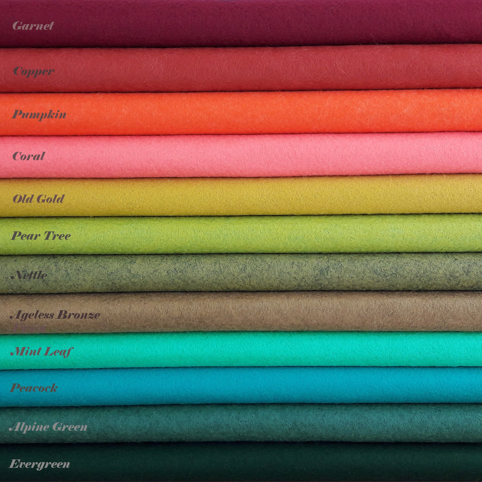 Shades; Garnet, Copper, Pumpkin, Coral, Old Gold, Pear Tree, Nettle, Ageless Bronze, Mint Leaf, Peacock, Alpine Green and Evergreen.