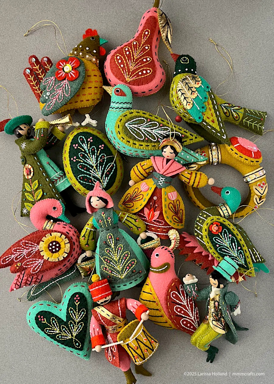 The Golden Pear Wool Felt Pack; the glowing fruit shades used in the 2025 palette used for the Twelve Days of Christmas by mmmcrafts. All from the WoolFelt® collection by National Nonwovens. Visit> The mmmcrafts pattern shop